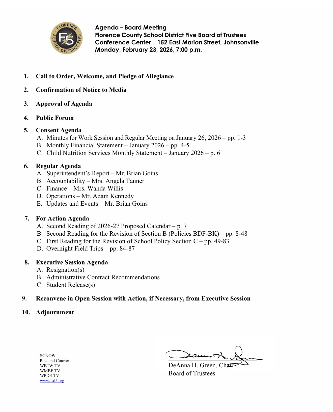 The board vests in its chairman of other presiding officer authority to terminate the remarks of any individual when he/she does not adhere to the rules established above. At any time, the board may adjourn the meeting or the chairman may recess the meeting and call the board into executive session.